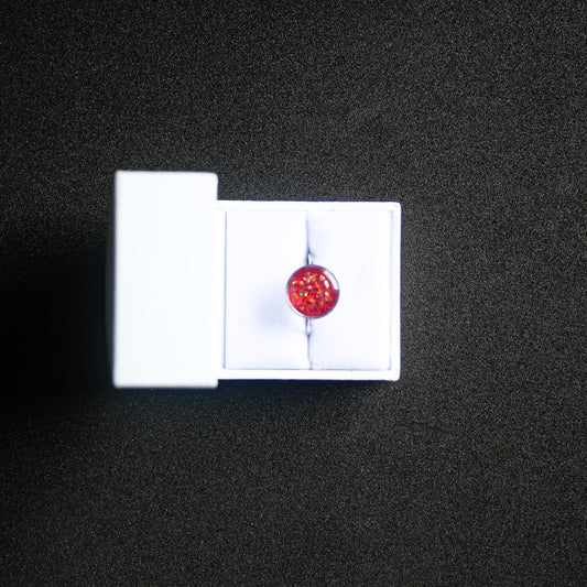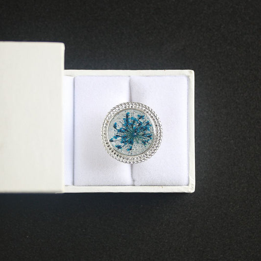 Bague fond blanc pailleté avec fleur séchée bleue