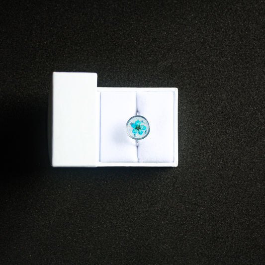Bague fond blanc fleur séchée bleue