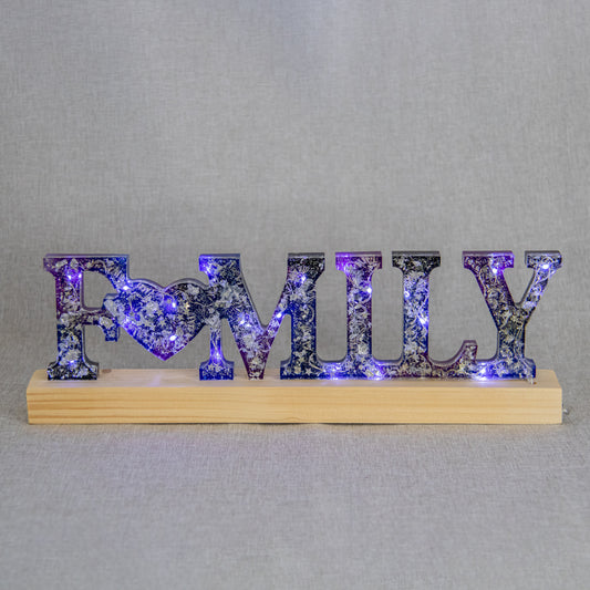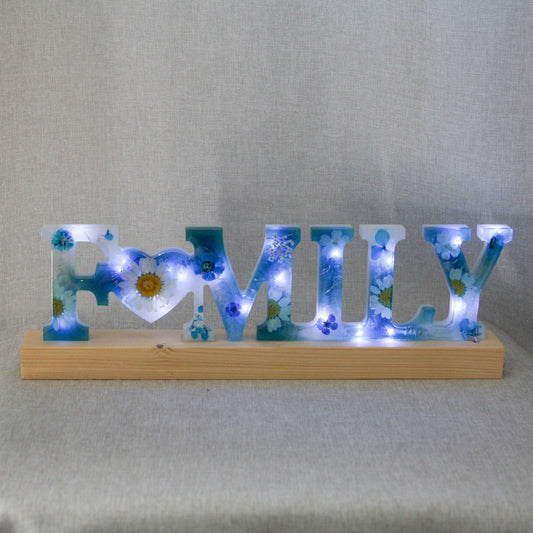 Veilleuse FAMILY fond blanc et bleu avec fleurs séchées