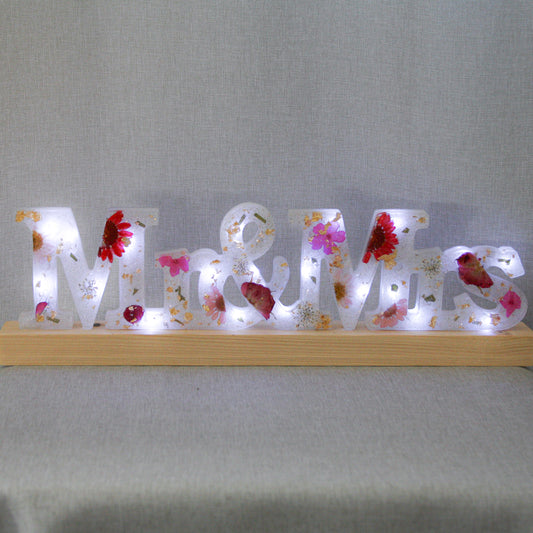 Veilleuse MR & MRS fond blanc avec fleurs séchées