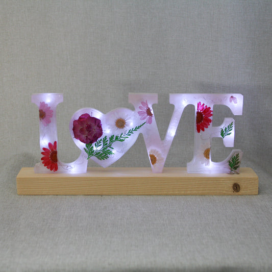 Veilleuse LOVE à LED fond blanc et fleurs séchées