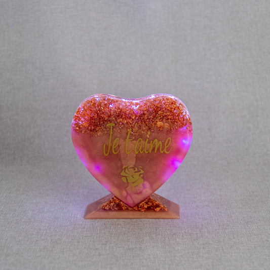 Veilleuse COEUR "Je t'aime" à LED rose et feuilles gold